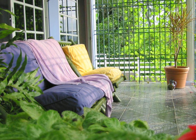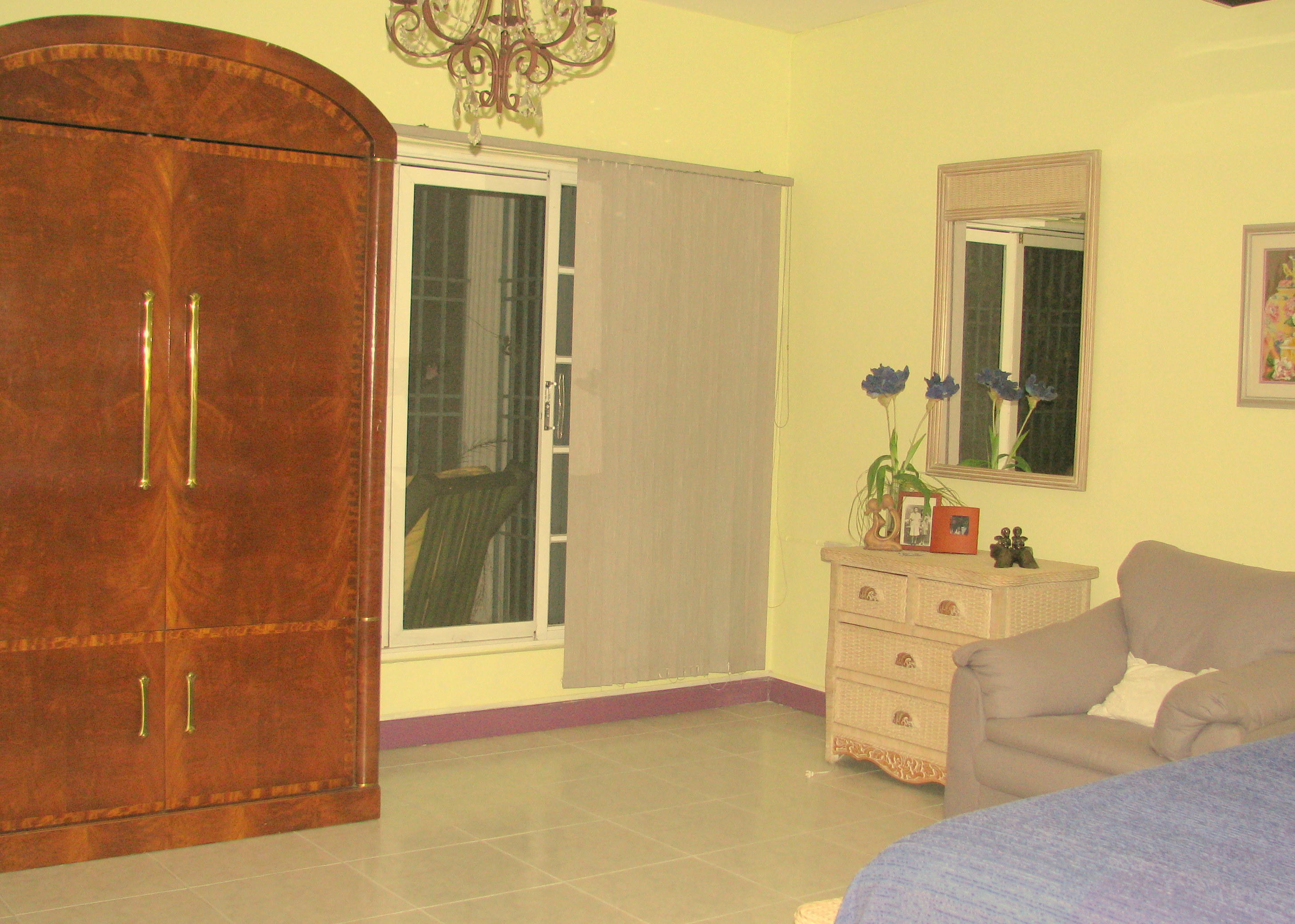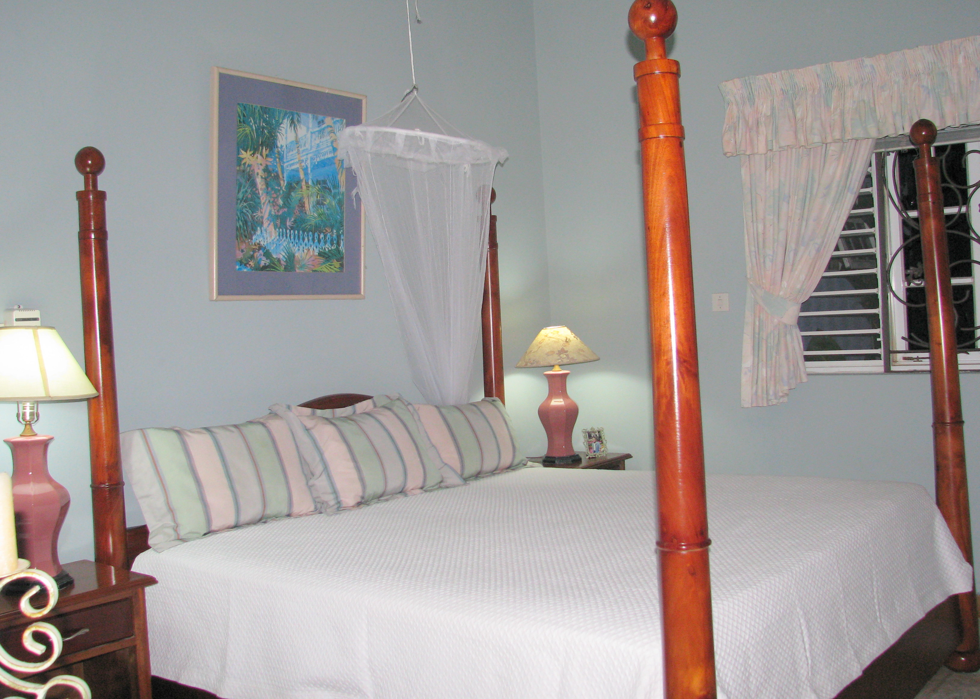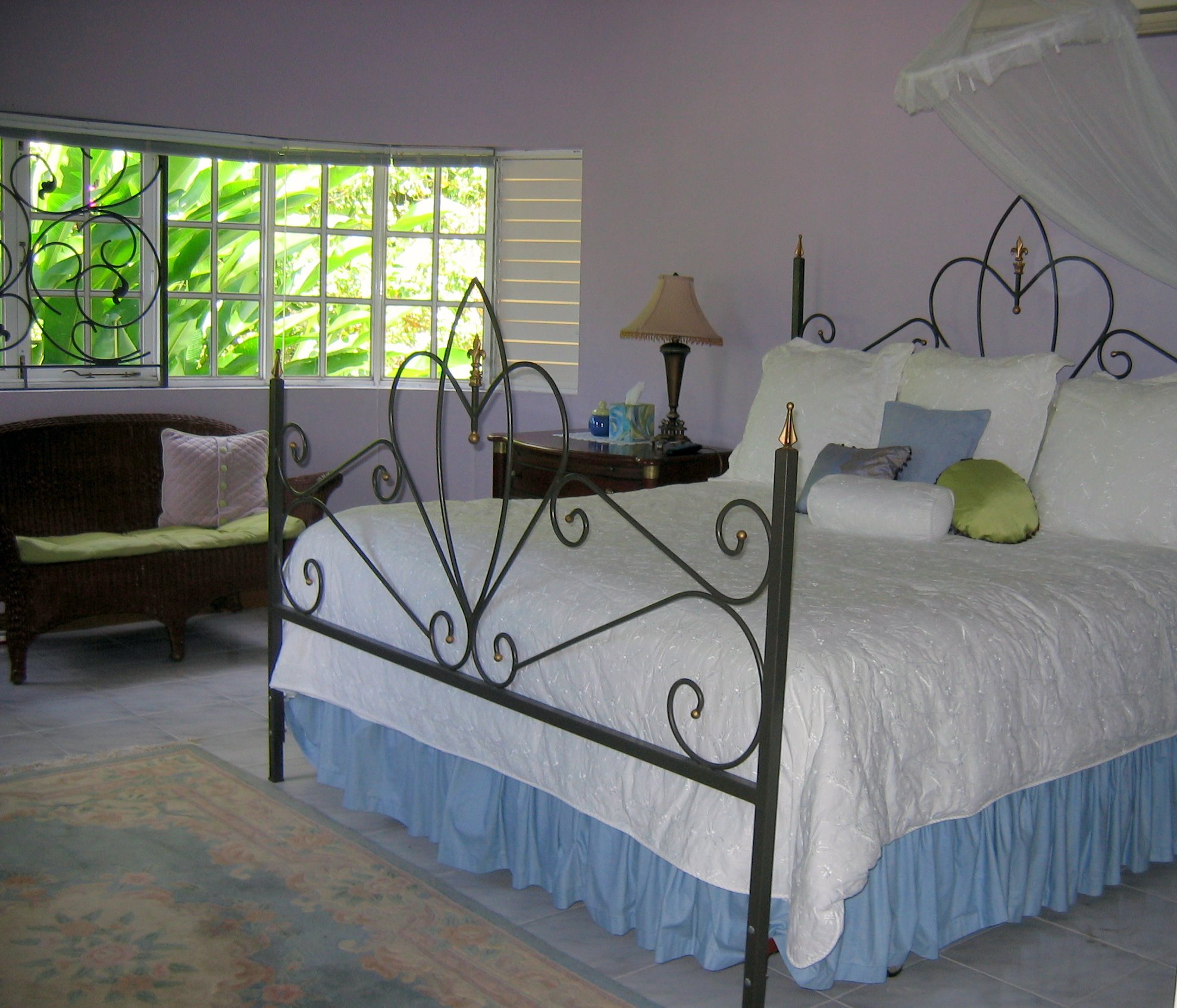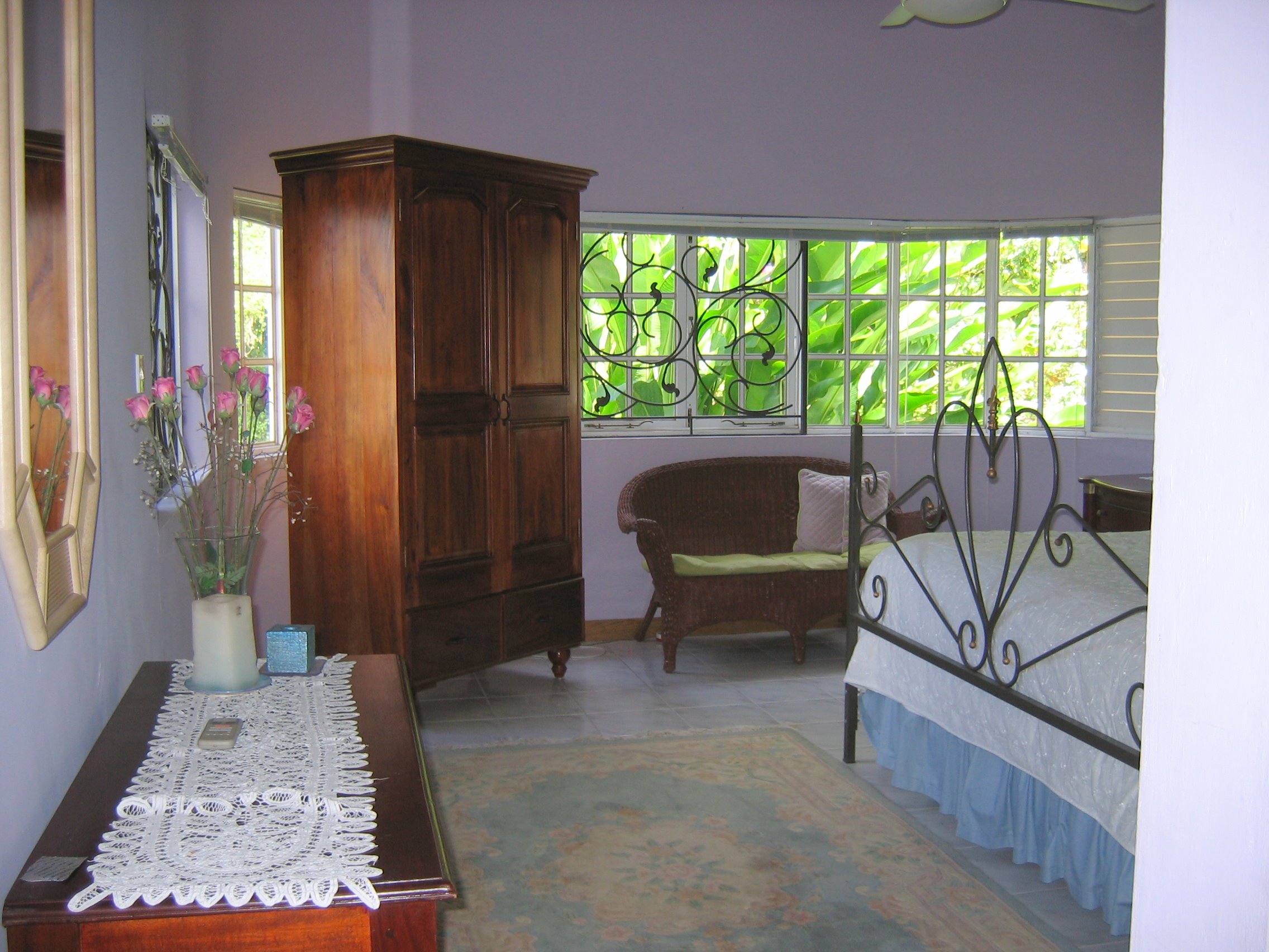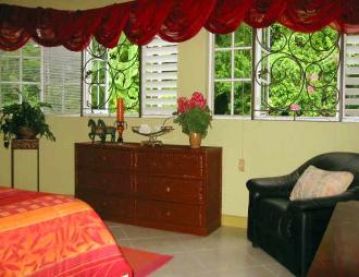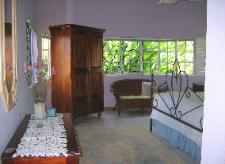 | HUMMING BIRD FAMILY SUITE is located on a separate level of this Jamaica vacation villa and features a queen sized bed, a queen sofa bed and a private patio. Very spacious accommodations makes it perfect for vacation lodgings for a small family. Bathroom w/shower across the hall. |