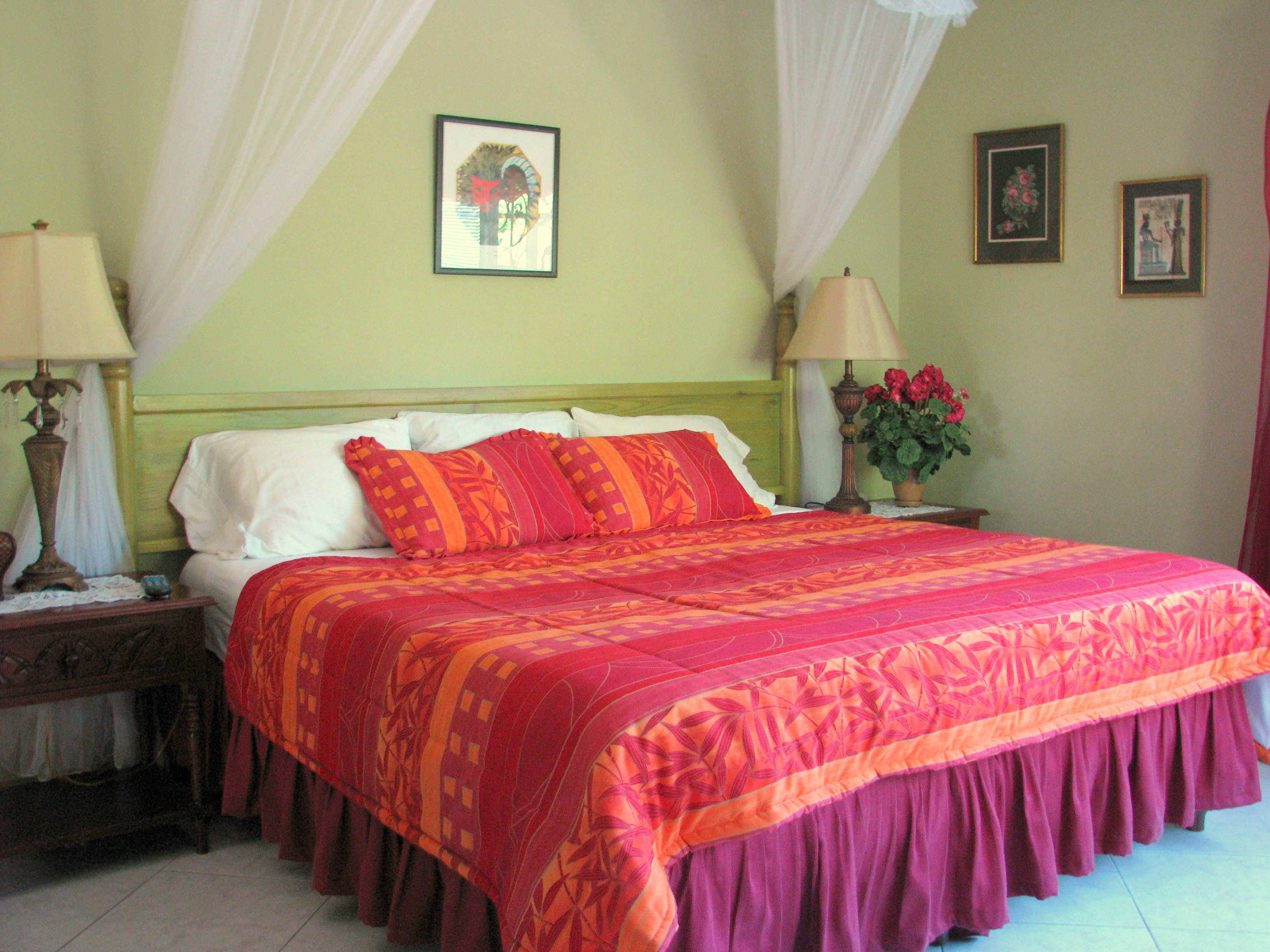 | SUNSET ROOM Warm, cosy, and vibrantly hued, this room reflects the fiery tones of our awesome Jamaica sunsets. This vacation accommodation features twin beds which can be converted to a king. Can accommodate an extra twin bed for a family vacation, a group of friends or a girlfriends getaway. |