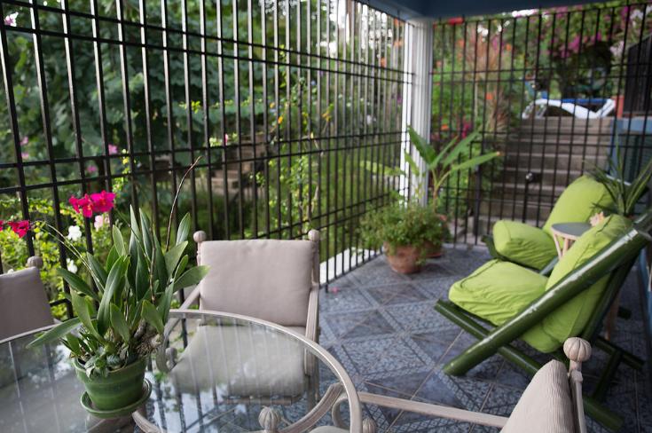 very cozy, private enclosed patio with table, chairs and sofa chairs. Located by the front door, on the street level of